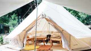 大型のテントが常設されていて、そのテントの中は、まるで高級ホテルかのような大きなベッドとソファー・テーブルなどが置かれていて、キャンプとは思えない贅沢さがあります。